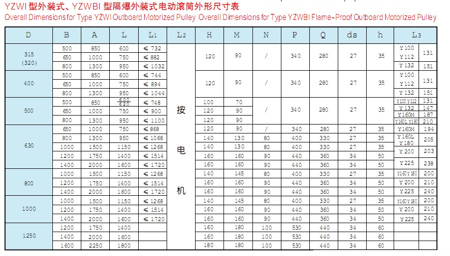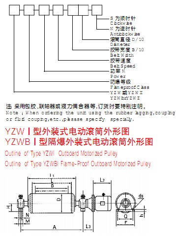該產(chǎn)品是供各種固定式帶式輸送機(jī)、斗式提升機(jī)、卷揚(yáng)機(jī)等配套的新型驅(qū)動(dòng)裝置。其內(nèi)部采用行星擺線減速機(jī)構(gòu),使電機(jī)外露與滾筒直聯(lián),具有承載能力大、過載能力強(qiáng)、傳動(dòng)平穩(wěn)、噪音低、壽命長(zhǎng),使用維修方便,操作安全可靠等優(yōu)點(diǎn)??蓾M足各種逆止、包膠等要求。隔爆外裝式電動(dòng)滾筒其隔爆標(biāo)志位dl、dllAT4。dl適合于有甲烷或煤塵礦井中,dllAT4適合于有I、IIA級(jí)T2~T4組爆炸危險(xiǎn)性混合物存在的場(chǎng)所,dllBT4適用于有I、IIA、IIB級(jí)T2~T4組爆炸危險(xiǎn)性混合物存在的場(chǎng)所。