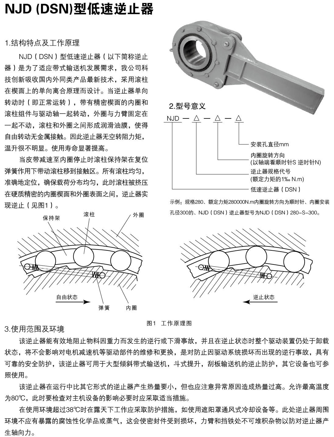 NJD(DSN)型低速逆止器(以下簡(jiǎn)稱逆止器)是為了適應(yīng)帶式輸送機(jī)發(fā)展需求,眾誠公司科技創(chuàng)新吸收國內(nèi)外同類產(chǎn)品最新技術(shù),采用滾柱在楔面上的單向離合原理而設(shè)計(jì)。當(dāng)逆止器單向轉(zhuǎn)動(dòng)時(shí)(即正常運(yùn)轉(zhuǎn)),帶有精密楔面的內(nèi)圈和滾柱組件與驅(qū)動(dòng)軸一起轉(zhuǎn)動(dòng),外圈與力臂固定在一起不動(dòng),滾柱和外圈之間形成潤滑油膜,使得自由轉(zhuǎn)動(dòng)無金屬接觸。因此逆止器無空轉(zhuǎn)阻力矩,溫升很不明顯。使用壽命顯著提高。