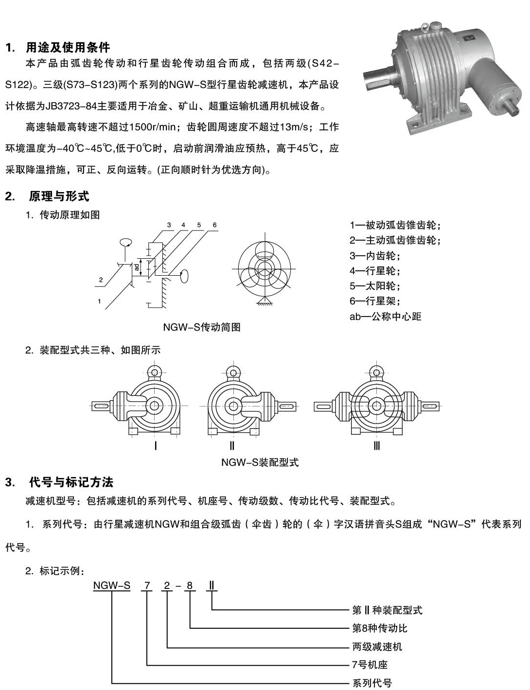 本產(chǎn)品由弧齒輪傳動和行星齒輪傳動組合而成,包括兩級(S42-S122)。三級(S73-S123)兩個系列的NGW-S型行星齒輪增速機,本產(chǎn)品設計依據(jù)為JB3723-84主要適用于冶金、礦山、超重運輸機通用機械設備。